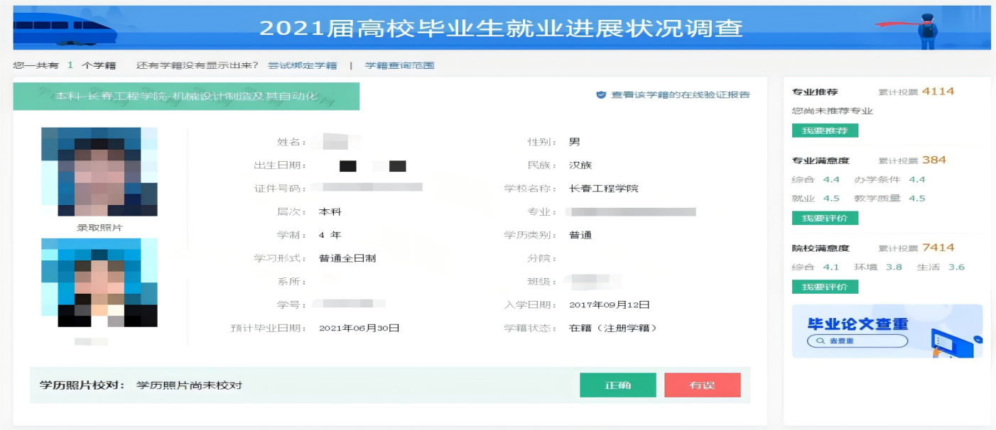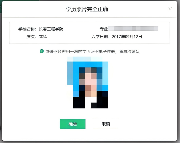 4.请各位同学务必认真核对所显示的照片信息,如果信息正确,则点击“正确”按钮,并在弹出的电子照片信息窗口点击“确定”提交。