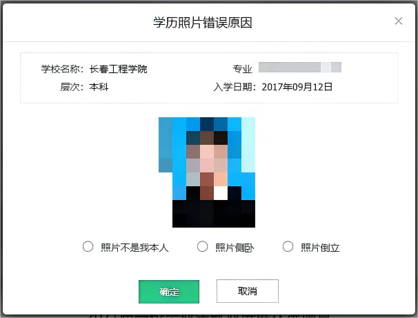 5.如果照片信息有误,请点击“有误”按钮,在弹出的窗口中,选择对应的错误项,最后再点击“确定”按钮提交。