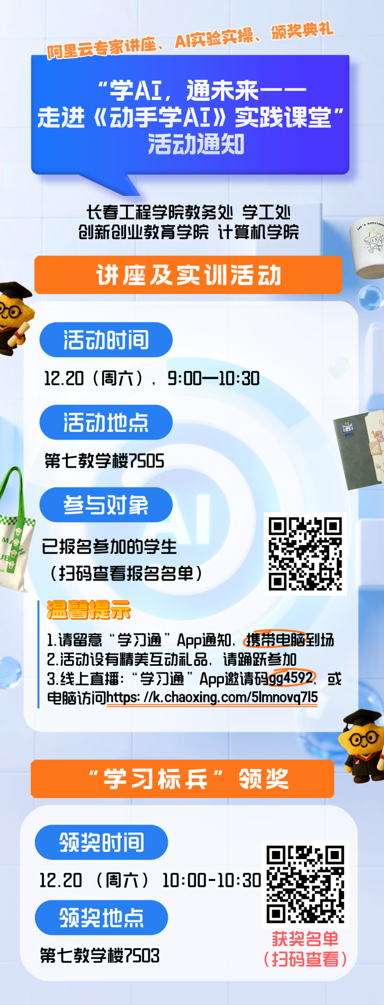 为助力我校学子深入掌握AI核心技能、拓展实践视野,学校定于2025年12月20日(星期六)上午9:00,在第七教学楼7505教室,举办“学AI,通未来——《动手学AI》实践课堂”线下讲座实训及颁奖仪式。活动由长春工程学院教务处、学生工作处、大学生创新创业教育学院、计算机技术与工程学院主办,超星尔雅与阿里云承办,包含专家讲座、互动实操及“学习标兵”颁奖典礼等环节。